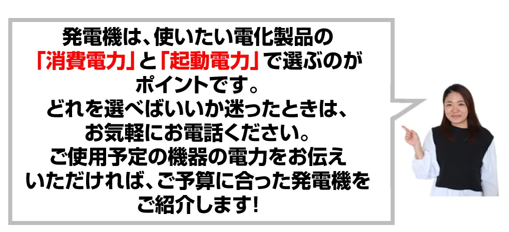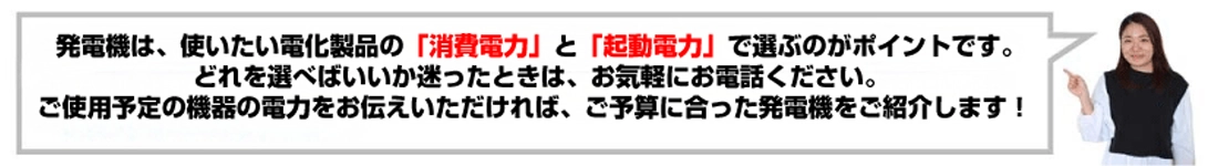 ●サポート体制は充分か?(当店では①消費電力、②起動電力、③使用時間をお電話でお伝えいただければ適した商品とレンタル料金合計をその場でお伝えします。)