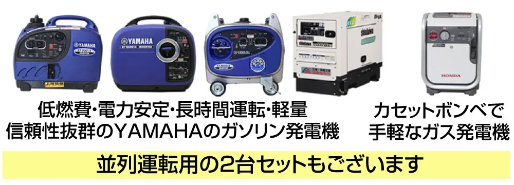 (当店では①消費電力、②起動電力、③使用時間をお電話でお伝えいただければ適した商品とレンタル料金合計をその場でお伝えします。)