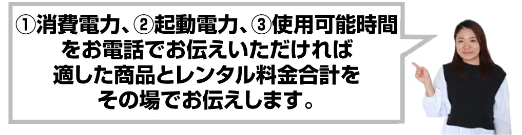 ●サポート体制は充分か?(当店では①消費電力、②起動電力、③使用時間をお電話でお伝えいただければ適した商品とレンタル料金合計をその場でお伝えします。)