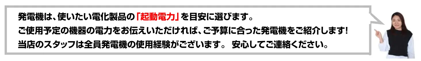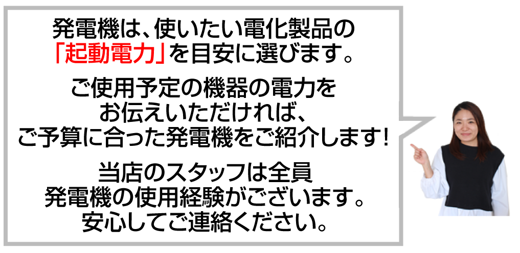 発電機は、使いたい電化製品の「起動電力」を目安に選びます。