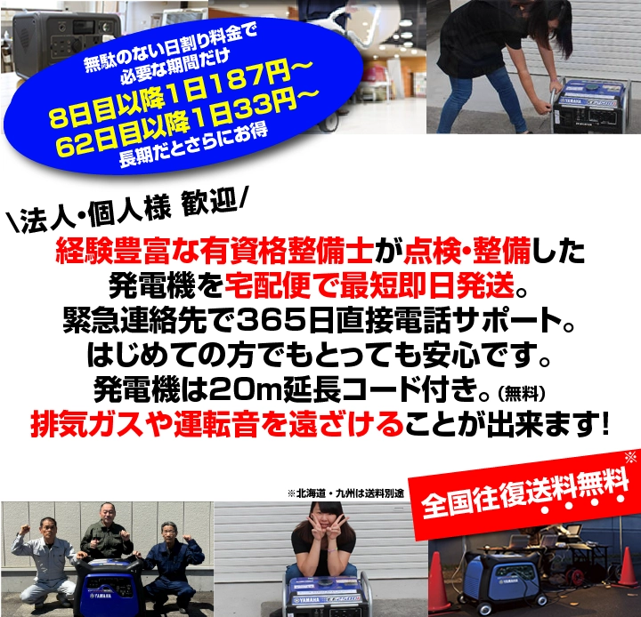 延長・延滞や紛失・返品などが無い限り、発電機のレンタルにその他の費用は一切かかりません。